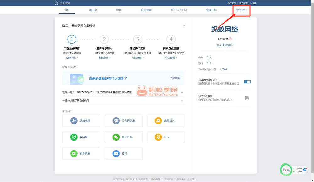 第二步,登录到企业微信网页管理后台,点击右上角的“我的企业”按钮。
