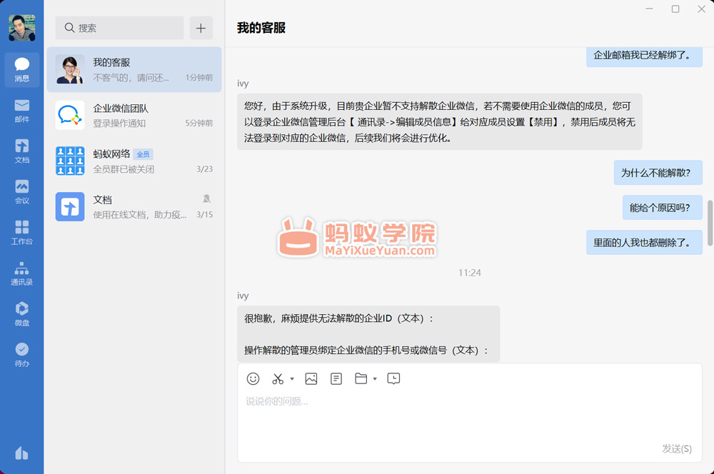 然后我就问她,我要解散企业微信,为什么不给我解散?